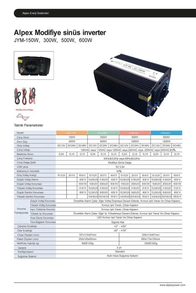 Alpex 12V - 300W Modifiye Sinüs İnverter, günlük enerji ihtiyaçlarınızı güvenilir ve ekonomik bir şekilde karşılamak için mükemmel bir seçenektir.
