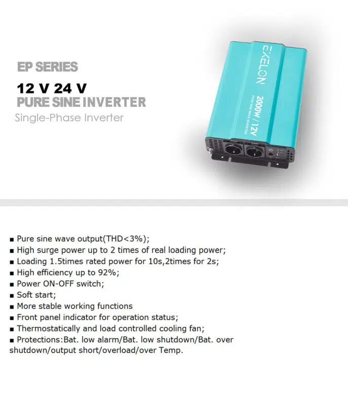 Exelon 12V 2000W Tam Sinüs İnverter, saf sinüs dalga çıkışı ile hassas elektronik cihazlar için güvenli ve stabil enerji sağlar. Solar sistemler, karavanlar, tekneler ve taşınabilir enerji çözümleri için mükemmel bir tercihtir.