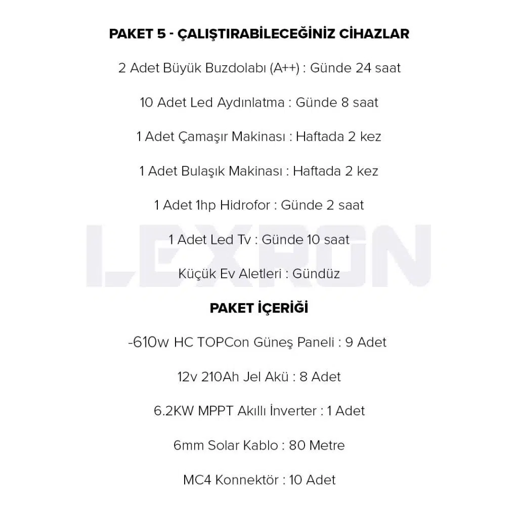 | Etiketler | Güneş Enerjisi Bağevi Hazır Solar Paket - 6.2Kw Mppt Akıllı İnverter + 9X 600W Güneş Paneli+ 8X 12V 210Ah Jel Akü |