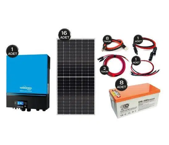 | Etiketler | Güneş Enerjisi Hibrit Paket 5 – 7.2Kva Inverter + Güneş Paneli +8 x 12 V 200 Ah Jel Akü Derin Döngü + Rüzgar Türbini |