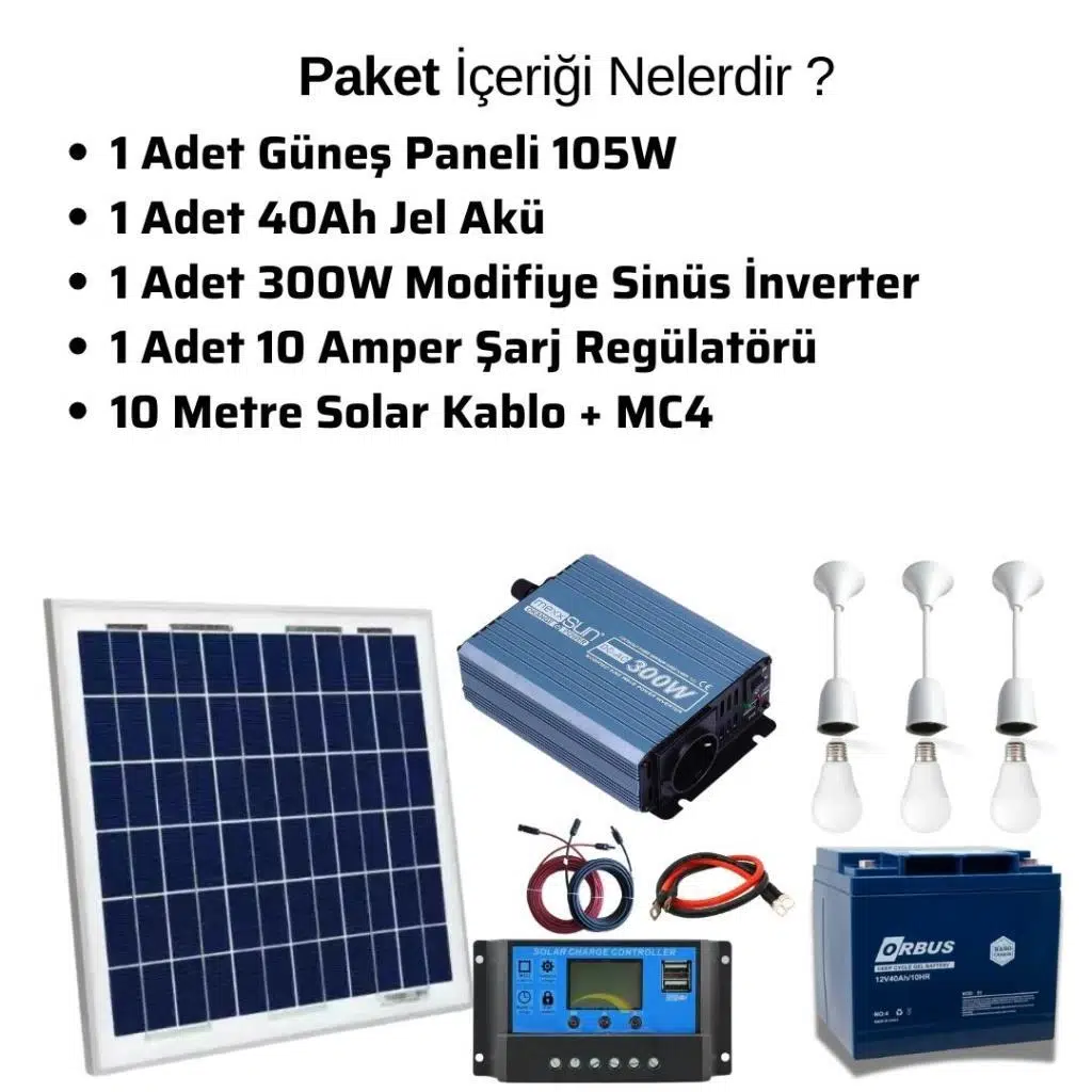 Güneş Enerjisi TV+ Aydınlatma Paketi - 300W ModifiyeSinus İnverter + 1x 12V 105W Güneş Paneli +1x 12V 40AH Jel Akü