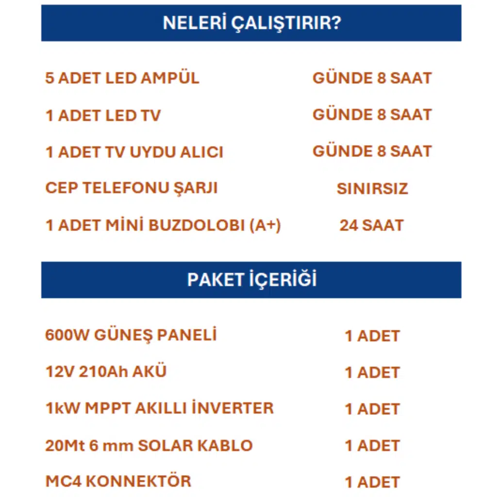 | Etiketler | Güneş Enerjisi TV + Mini Buzdolabı + Aydınlatma Plus Paket- 1Kw Mppt Akıllı İnverter + 600W Güneş Paneli + 210Ah Jel Akü |