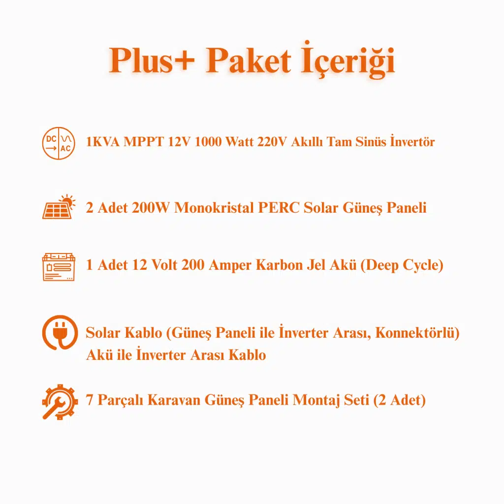 Karavan Solar Enerji Paketi 1kVA MPPT İnverter 2x205W Güneş Paneli 200Ah Karbon Jel Akü