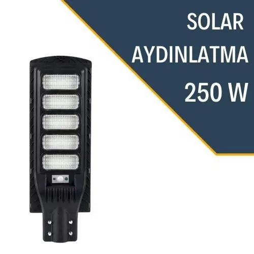 Lexron 250W Solar Aydınlatma Armatürü, yüksek verimli LED teknolojisi, LiFePO4 batarya ve güçlü polycrystalline güneş paneli ile sokak, bahçe, park ve açık alanlar için ideal bir aydınlatma çözümü sunar.