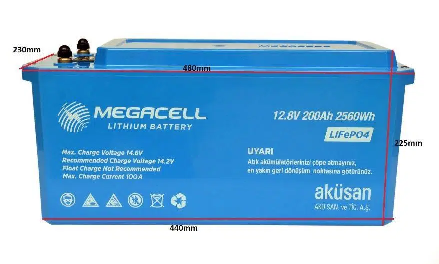 | Etiketler | Megacell 12.8V 200Ah Bluetooth Lifepo4 Lityum Demir Fosfat Akü Abs Kasa |