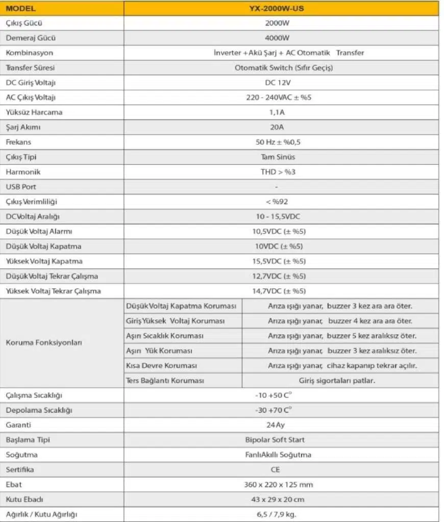 Çıkış Tipi:Tam Sinüs (THD <%3)