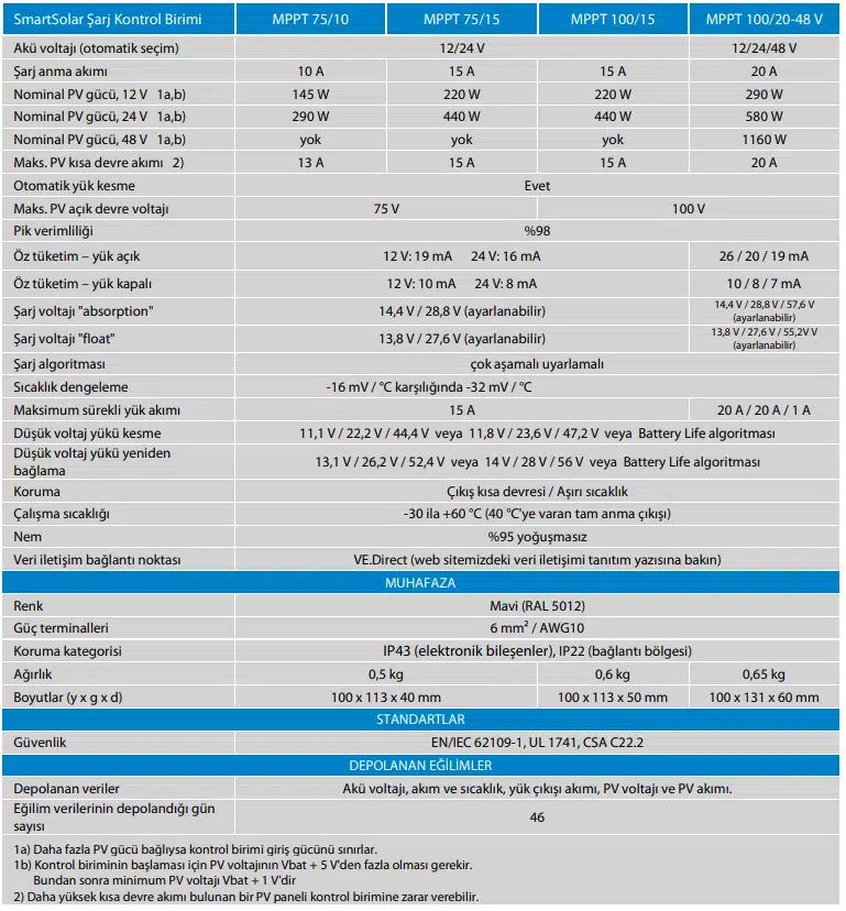 | Etiketler | Victron Smartsolar Mppt 75/15 – Gelişmiş Bluetooth Özellikli Solar Şarj Kontrol Cihazı SCC075015060R |