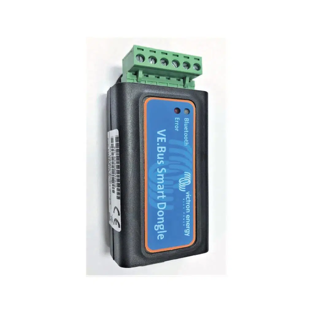 Victron VE.Bus Smart Dongle, MultiPlus, MultiPlus-II, Quattro ve Phoenix Inverter serisi için geliştirilmiş Bluetooth bağlantılı bir aksesuar olup, VictronConnect uygulaması üzerinden uzaktan izleme ve kontrol imkanı sunar.
